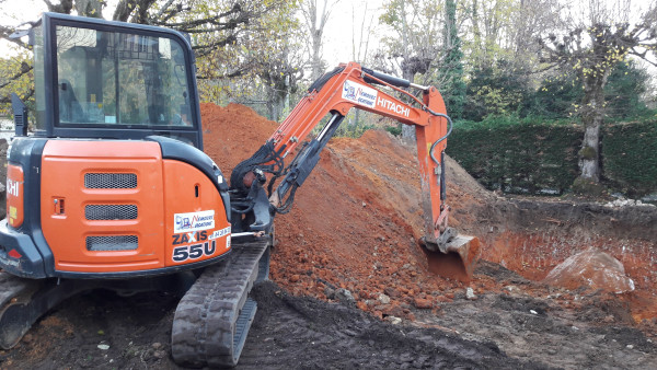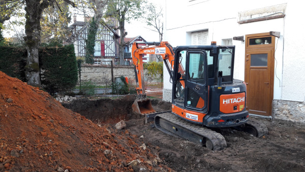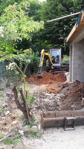 Arrivée de la pelle mécanique et début de creusage derrière la maison.