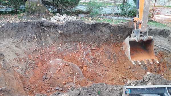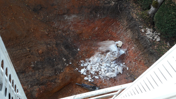 Découverte de la pierre géante dans le sol derrière la maison, on verra demain mais pour l'instant elle ne bouge pas, il va probablement falloir louer un marteau-piqueur à installer sur la pelle pour le casser.
