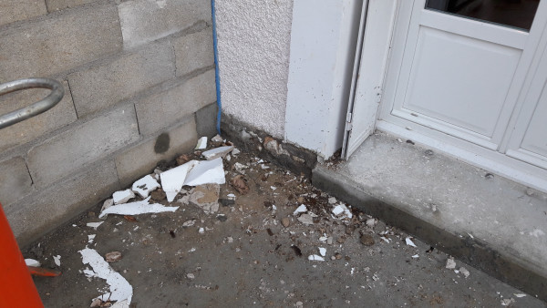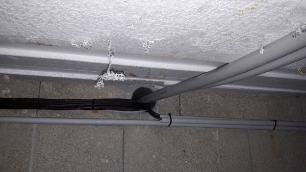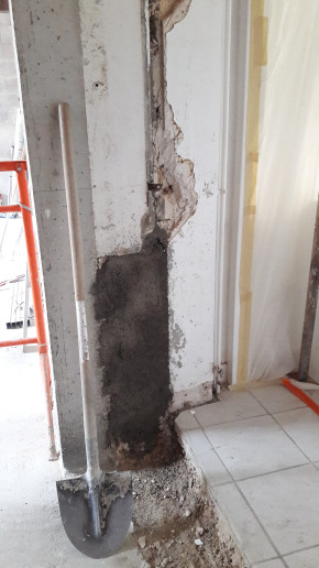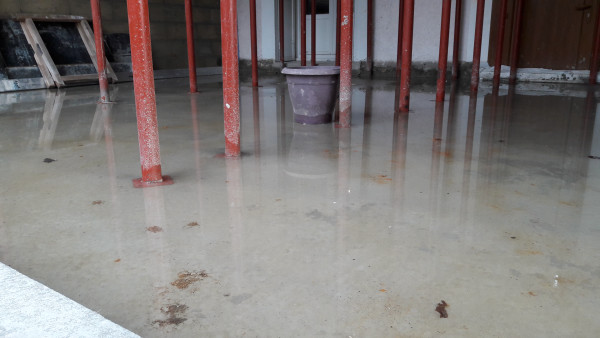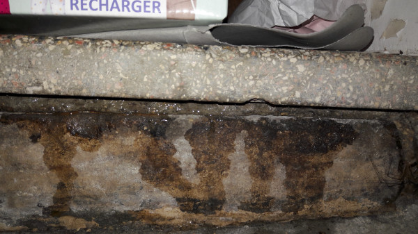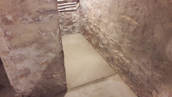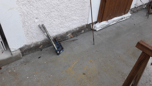 Après une semaine calme (il fait un temps peu propice aux travaux, et la dalle doit sécher avant la reprise), on découvre une petite infiltration d'eau au niveau de la porte à côté de l'escalier de la cave.