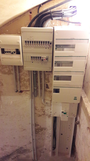 Et pendant ce temps-là Enedis nous a branché au nouveau poteau, déplacé le compteur dans le boitier à l'extérieur, et l'électricien a fait les branchements à l'intérieur derrière le tableau qui servira à l'extension :