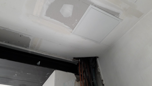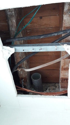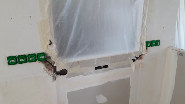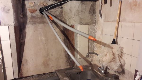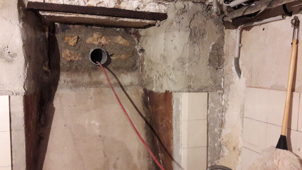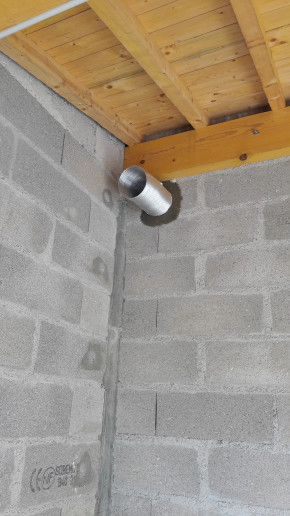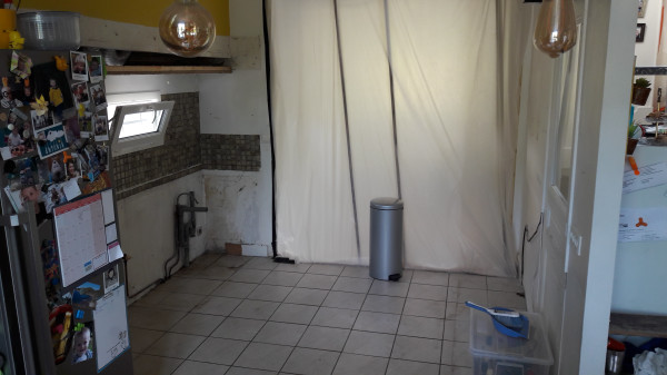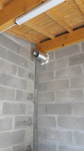 Autre raté, on voulait une extraction vers l'extérieur pour la hotte de la cuisine, mais on a complètement oublié de faire faire le trou. Du coup on va faire sans dans un premier temps (évidemment en plus l'endroit où on veut percer tombe mal et il va falloir percer en biais).
