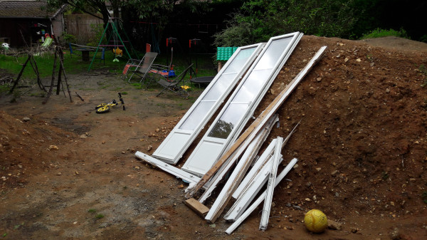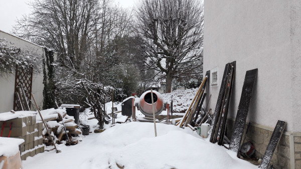 Dernier gag de la journée, la porte qui donnait directement sur la terrasse, celle qui est sous l'escalier donc, va gêner pour couler la dalle du plancher de l'extension. On réfléchit à une solution qui nous permette de passer le reste du chantier au chaud ⛄.