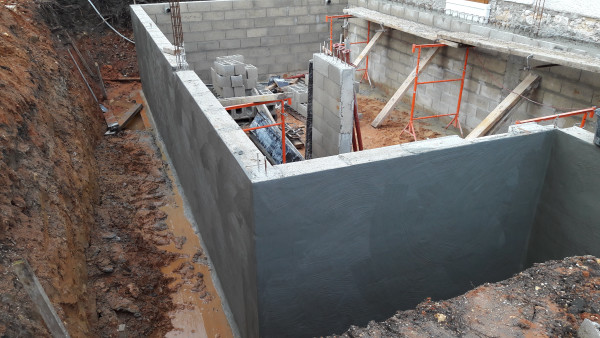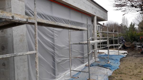 À la faveur d'un temps relativement sec, enduit sur les parpaings.