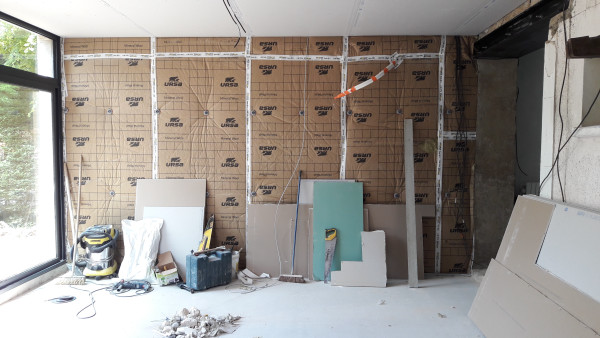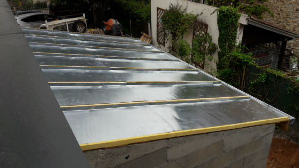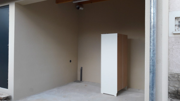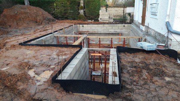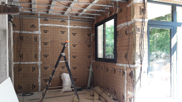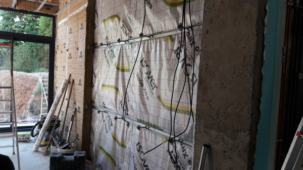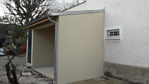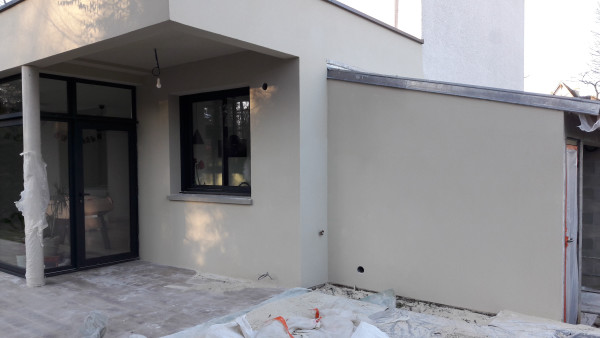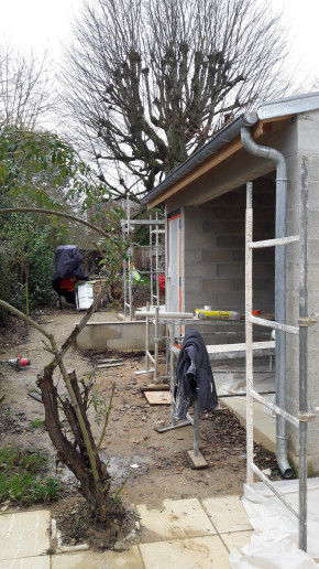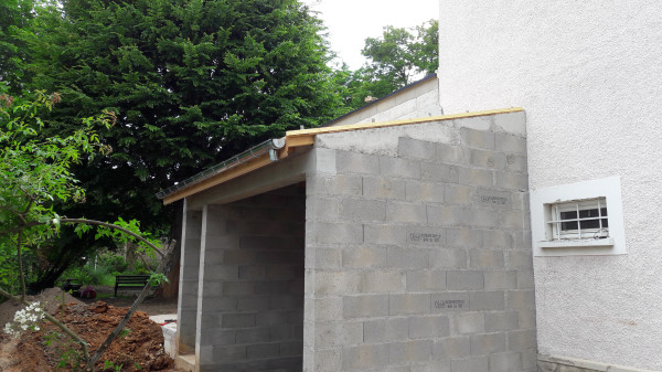 Aussi, préparation du fond de l'abri à vélo, où une partie était composée du mur extérieur de la maison existante, qu'il a fallu recouvrir d'un matériau plus propice au ravalement.