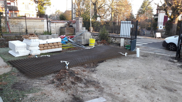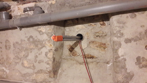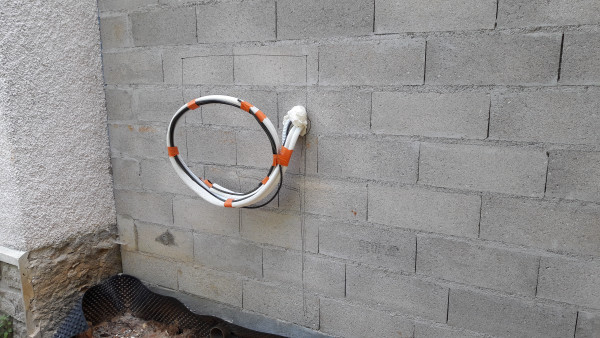 Après discussion avec M. Pacitti, il s'avère que c'est une mauvaise idée car ça nous fait casser la fondation du muret et à terme la partie à gauche de la niche risque de s'affaisser. Il faudrait passer en-dessous des fondations du muret. Il me dit qu'on devrait pouvoir s'arranger avec le prestataire et propose d'être là quand il passe demain.