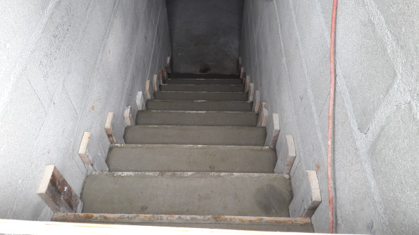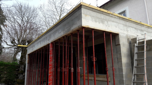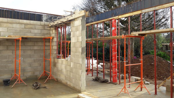 Reprise du chantier (après quelques petites livraisons ces derniers jours), avec ajout de quelques parpaings au niveau de l'escalier et décoffrage du pilier.