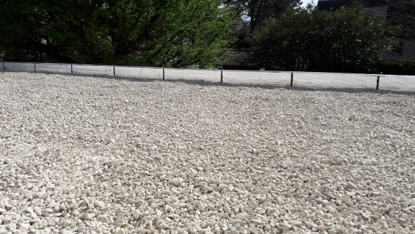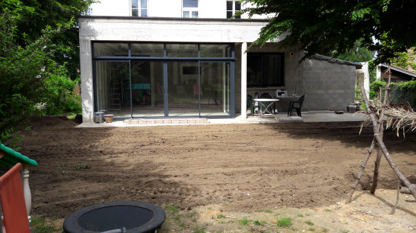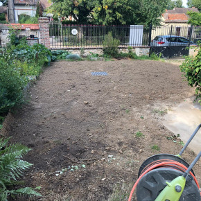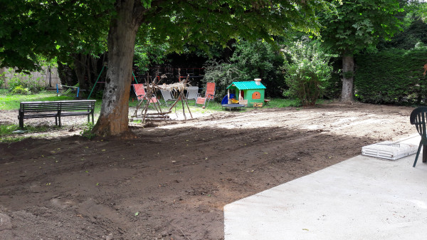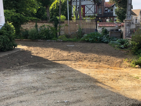 Aujourd'hui, pose de la nappe puis déplacement de la terre pour venir remblayer autour des parpaings. On va enfin revoir le jardin !