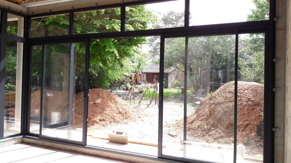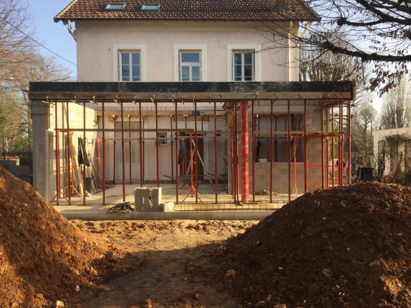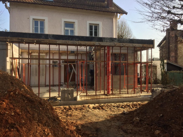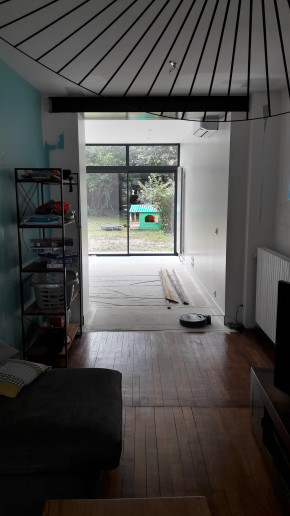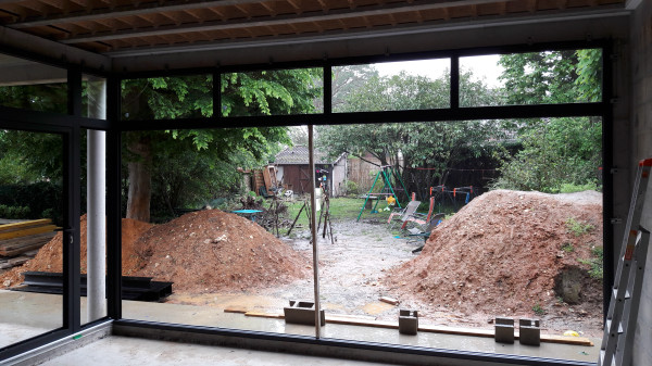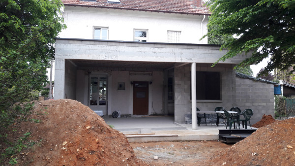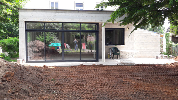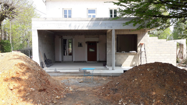La surprise du jour, c'est qu'on ne pourra finalement pas faire les deux marches pour descendre dans le nouveau séjour, ça mettrait la terrasse plus basse que le sol du jardin, ce qui pose évidemment problème.