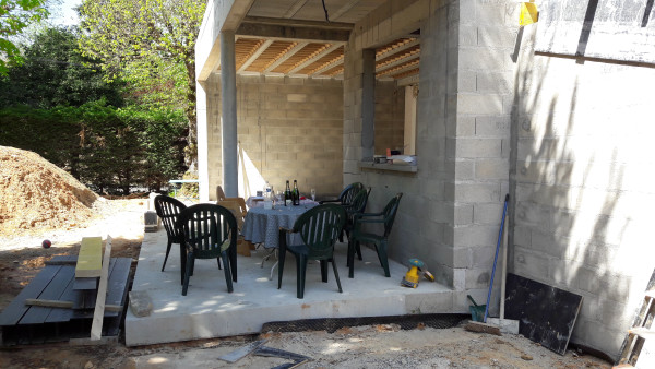 Et discussion avec M. Pacitti sur la suite des opérations, vu qu'on part en vacances demain pour une quinzaine de jours. D'après lui, si tout va bien tout sera fini à notre retour, tout étant la cuve remblayée, recouverte et tuyautée jusqu'à la cave, les évacuations d'eaux de pluie jusqu'à la cuve, le carrelage extérieur jointé et coupé, les dernières bandes posées et le placo de la niche découpé, l'ancienne porte de la cuisine remplacée par une cloison, et je pense ne rien avoir oublié.