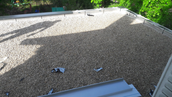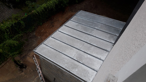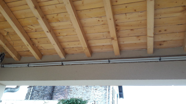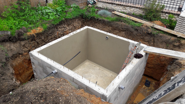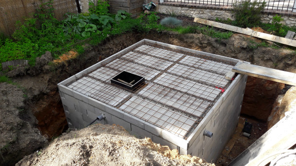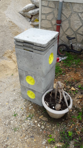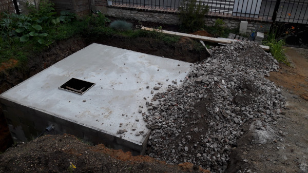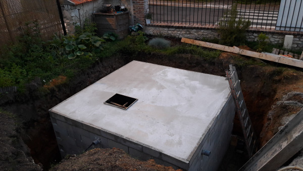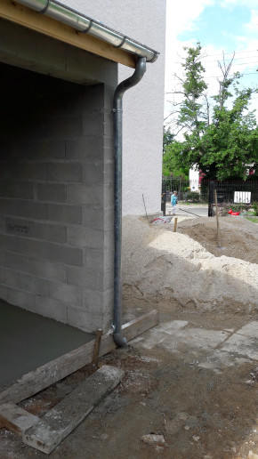 Quant à la cuve, sa trappe est posée et le raccordement aux gouttières est en cours.