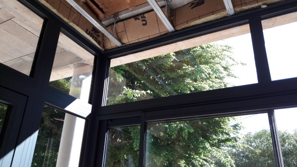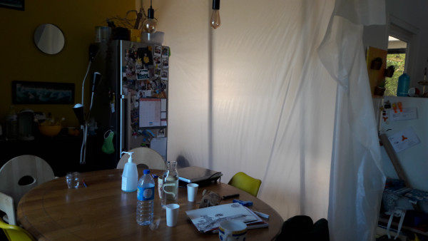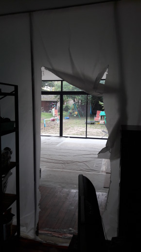 On a aussi appris que le plombier ne passerait pas vendredi mais seulement mardi prochain, ce qui repousse notre cuisine temporaire, alors pour se consoler on a ouvert la bâche entre le salon et l'extension.