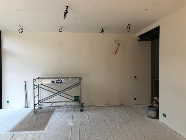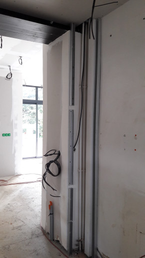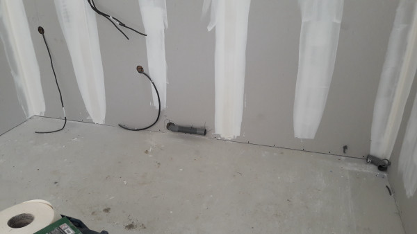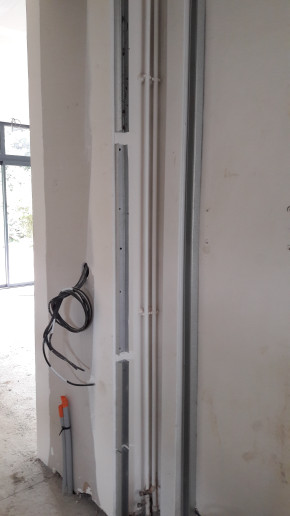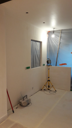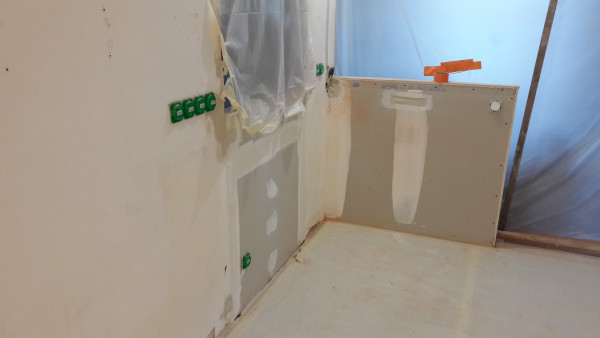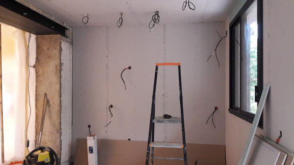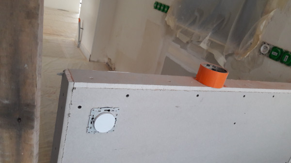 L'interrupteur blanc de la photo ci-dessus a été déplacé de l'autre côté de la cloison (photo ci-dessous), vu que sinon il tombait dans les meubles de la future cuisine (je suis content qu'on s'en soit rendu compte maintenant et pas au moment de la pose de la cuisine).