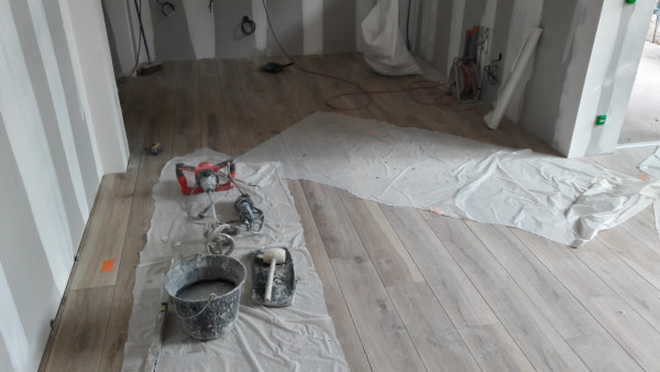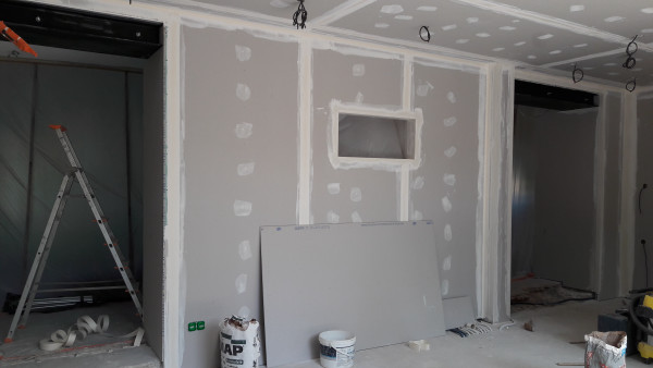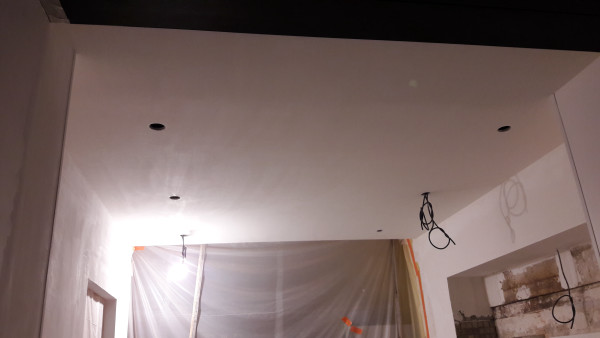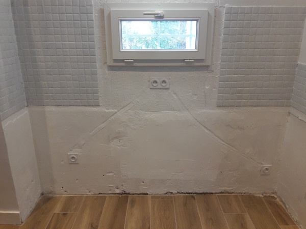 Passage des maçons pour poser le dernier petit bout de carrelage dans la cuisine (celui qu'on n'avait pas mis en prévision du déplacement des tuyaux), faire les dernières bandes sur le placo et de l'enduit à droite à gauche.