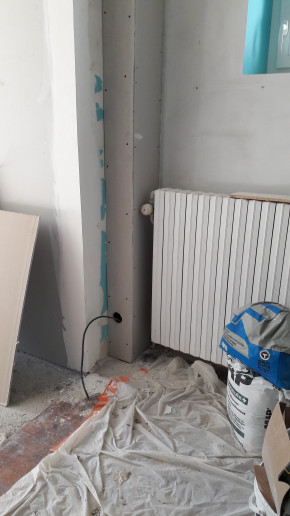 Ça commence à cailler, alors j'ai insisté pour que le plombier vienne installer celui des deux radiateurs qu'il a reçu, ce qui va permettre de remettre en eau le circuit de chauffage.