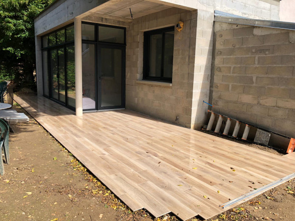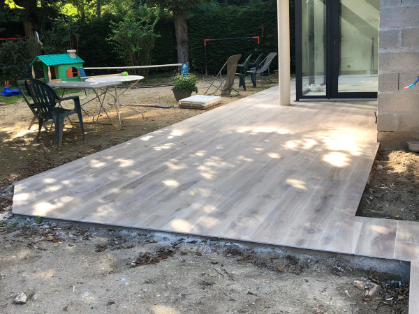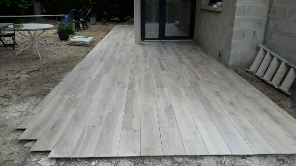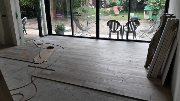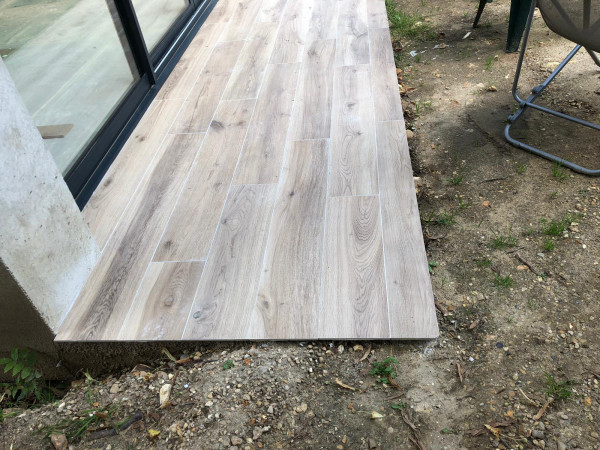 Carrelage extérieur, il ne reste plus que le joint et les découpes à faire.