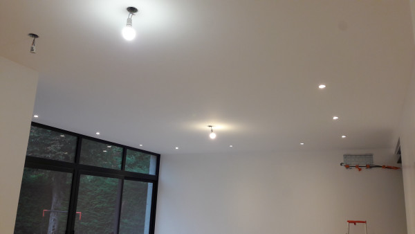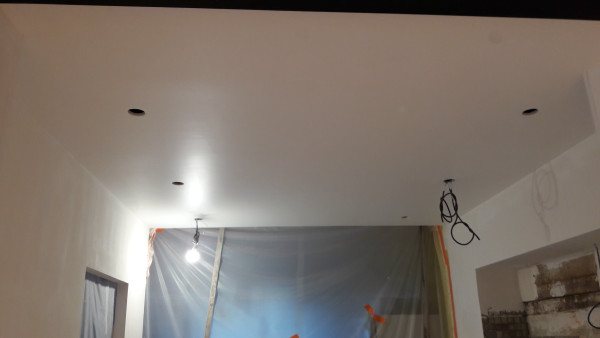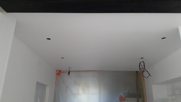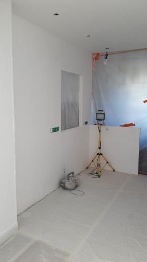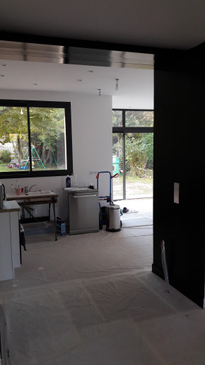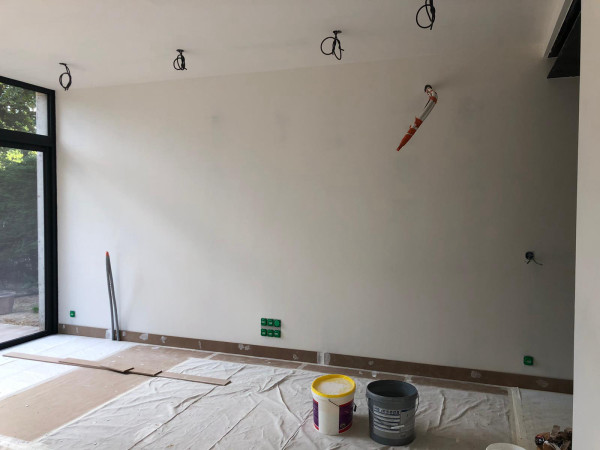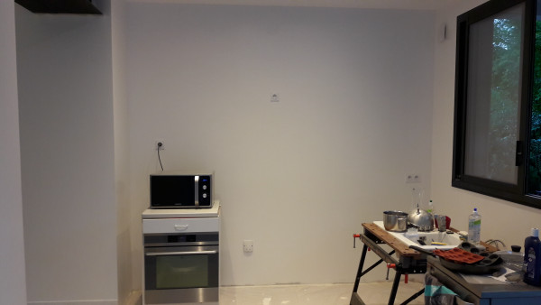 Fin de la peinture côté extension la semaine dernière. Je ne sais pas s'ils se sont occupés du mur où sera la hotte (j'arrive pas à faire la différence entre la primaire et la peinture ^_^), mais si c'est le cas il faudra le refaire vu qu'on va devoir reboucher un trou suite au déplacement de la prise de la hotte.