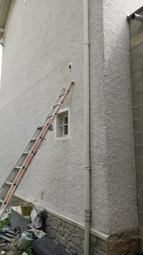 Et aussi finition au ciment autour du tuyau de sortie de la vmc de la cuisine (faite par le maçon parce que l'électricien a dit qu'il ne savait pas faire de ciment et qu'il fallait du ciment et pas du MAP pour que le ravalement tienne bien).