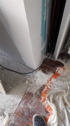 Arrivée de l'électricien, qui perce le mur pour préparer l'arrivée des câbles au tableau électrique.