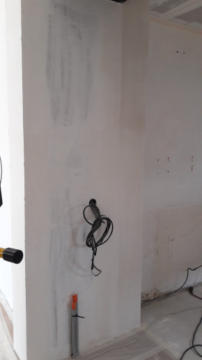 L'interrupteur blanc de la photo ci-dessus a été déplacé de l'autre côté de la cloison (photo ci-dessous), vu que sinon il tombait dans les meubles de la future cuisine (je suis content qu'on s'en soit rendu compte maintenant et pas au moment de la pose de la cuisine).