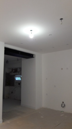 Fin de la peinture côté extension la semaine dernière. Je ne sais pas s'ils se sont occupés du mur où sera la hotte (j'arrive pas à faire la différence entre la primaire et la peinture ^_^), mais si c'est le cas il faudra le refaire vu qu'on va devoir reboucher un trou suite au déplacement de la prise de la hotte.
