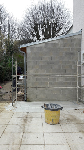 Aussi, préparation du fond de l'abri à vélo, où une partie était composée du mur extérieur de la maison existante, qu'il a fallu recouvrir d'un matériau plus propice au ravalement.